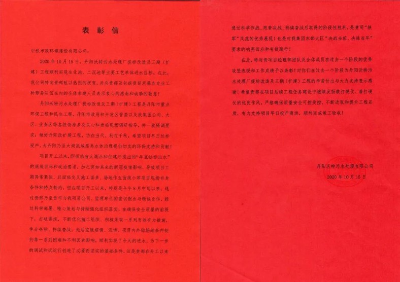 公司丹陽沃特污水處理廠提標改造及三期(擴建)工程項目部與丹陽沃特污水處理有限公司、監理單位密切配合、精心策劃,持續強化組織落實,先后克服疫情、汛情、項目內外部場地條件制約等困難,于10月15日順利實現生化池、二沉池等主要工藝單體進水目標,充分展現了市政“鐵軍”風采。為此,丹陽沃特污水處理有限公司特發表彰信至公司,表示衷心感謝和誠摯敬意。