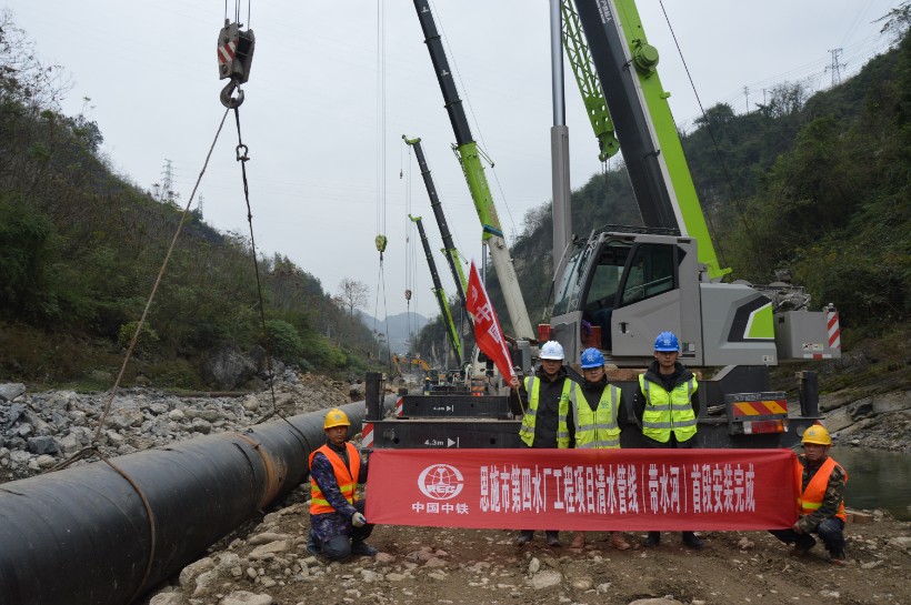 12月14日,重達36噸的清水管在4臺35噸汽車吊合力下,穩穩落入管線預設基槽,標志著恩施市第四水廠清水管線首段100米成功完成鋪設。