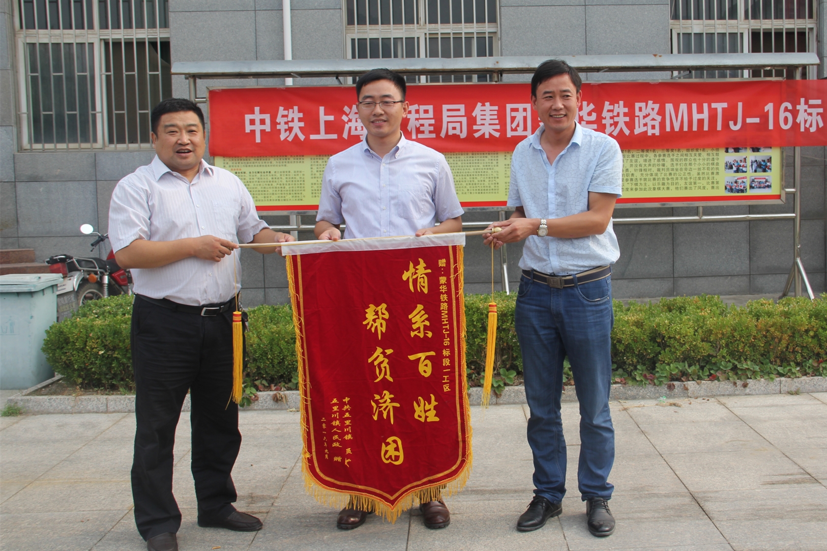 9月18日,來(lái)自河南省盧氏縣五里川鎮(zhèn)19個(gè)貧困村的143個(gè)貧困戶齊聚鎮(zhèn)政府,領(lǐng)取了由蒙華鐵路16標(biāo)一工區(qū)援助的5000只脫貧致富雞苗。該工區(qū)項(xiàng)目黨支部積極參與地方“精準(zhǔn)扶貧”,彰顯央企社會(huì)責(zé)任,與當(dāng)?shù)劓?zhèn)黨委、政府建立了良好的溝通交流機(jī)制,同時(shí)與當(dāng)?shù)卮迕窠⒘撕椭C、穩(wěn)定的良好關(guān)系。圖為縣政府代表和鎮(zhèn)黨委書(shū)記為一工區(qū)獻(xiàn)錦旗。